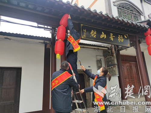 当日上午,襄阳公司烟店党小组成员步行来到烟店镇政府,与相约的镇政府工作人员碰头后,一起来到了烟店村的街道上,开展今天的主题活动——大红灯笼高高挂。