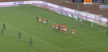 66'51" 进球了!武汉卓尔 0:1 北京国安。奥古斯托直接任意球右脚射门,球窜入对方球门右上角。