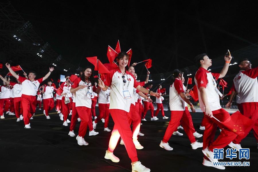 7月3日,中国大学生体育代表团在开幕式上入场。 当日,第30届世界大学生夏季运动会在意大利那不勒斯开幕。 新华社记者孟永民摄