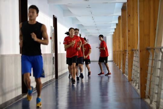 队员在下水训练前热身,徐嘉余跑在第一个。