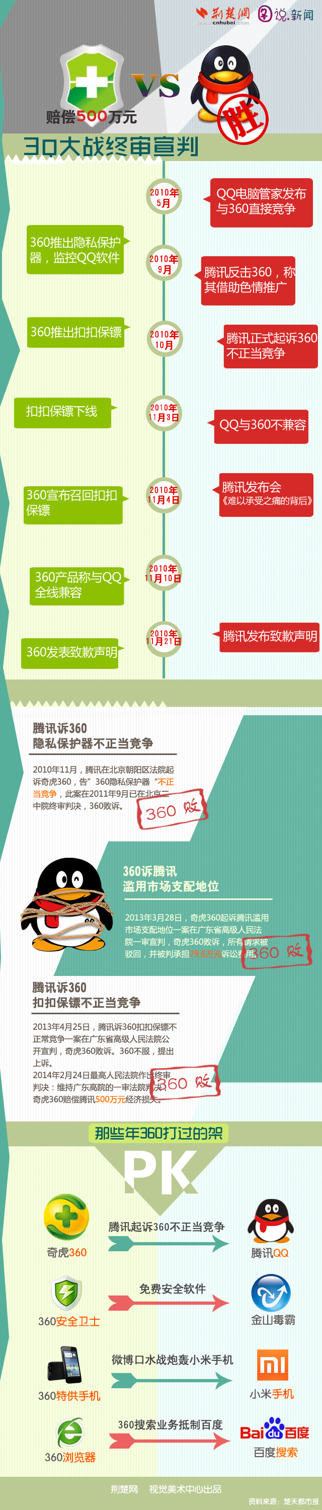 2月24日,下午3点左右,最高人民法院对腾讯诉奇虎360不正当竞争案作出终审判决,驳回奇虎360的上诉,维持一审法院的判决。奇虎公司被要求赔偿500万元。
