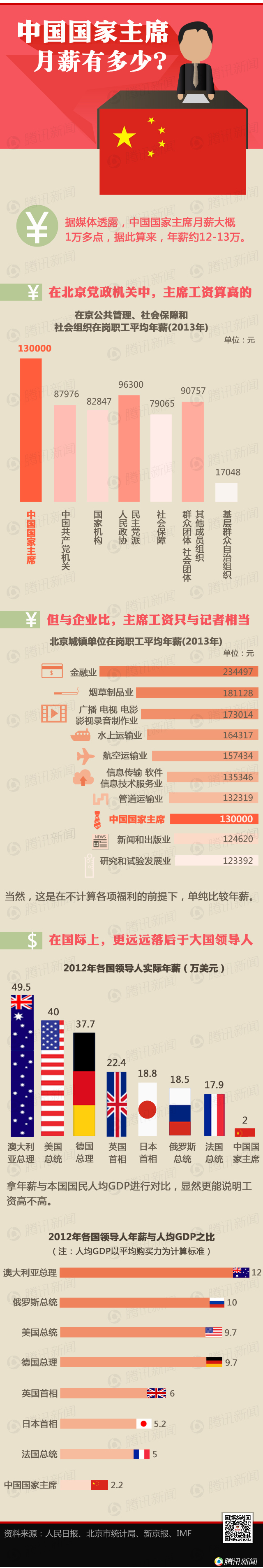 据媒体透露,中国国家主席月薪大概1万多点,这在北京与记者网编平均工资相当。与国际上其他大国领导人的工资相比,更是非常少。