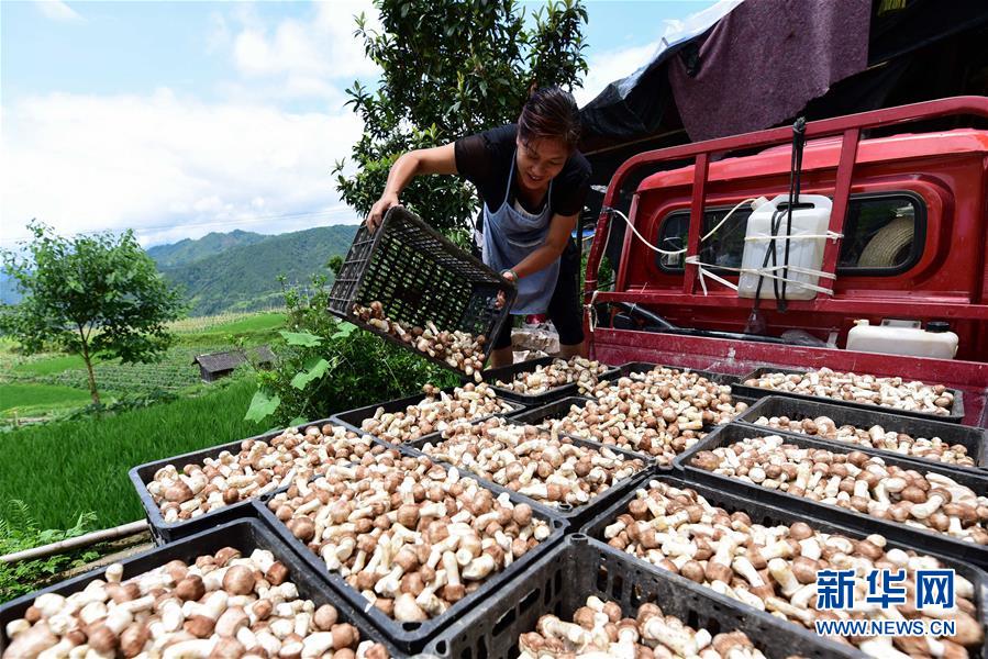 贵州省丹寨县排调镇也改村村民在转运姬松茸,准备供应市场(2018年7月25日摄)。 新华社发(杨武魁 摄)