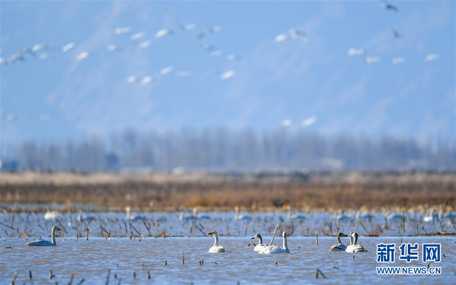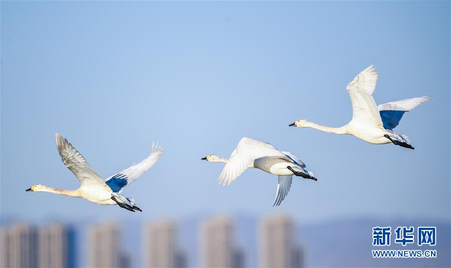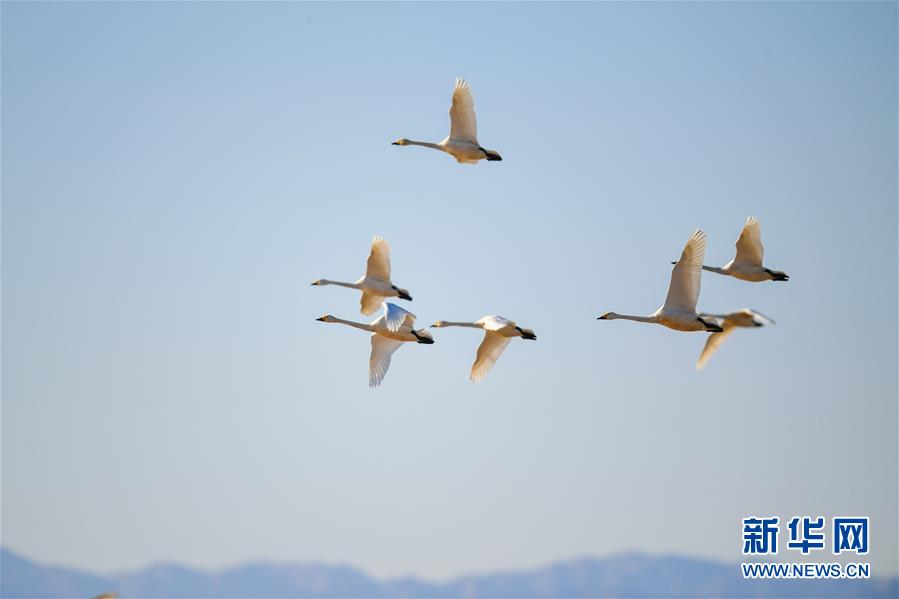 3月12日,天鹅在内蒙古鄂尔多斯市达拉特旗境内的黄河沿线湿地上空飞翔。 随着天气转暖,冰雪消融,内蒙古鄂尔多斯市达拉特旗境内黄河沿线湿地中栖息的天鹅成为早春时节一道亮丽的风景线。 新华社记者 彭源 摄