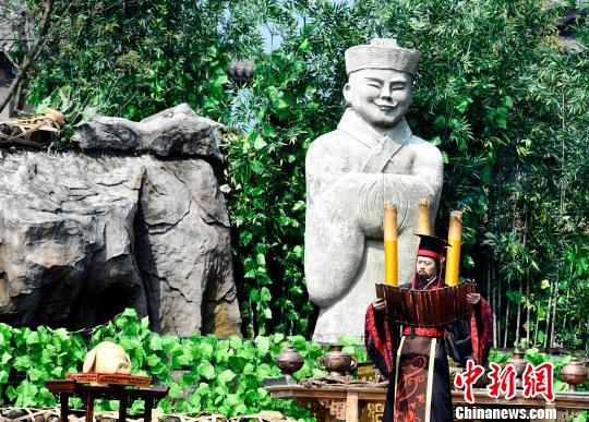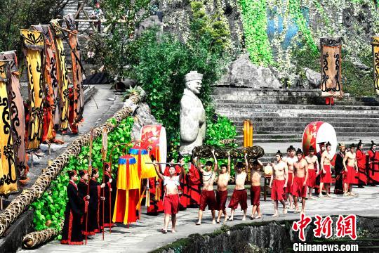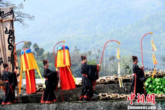 4月5日,四川都江堰举行放水节,重现两千年前“古法治水”情景。图为古装仪仗队。 安源 摄