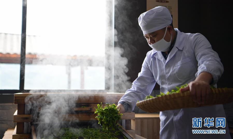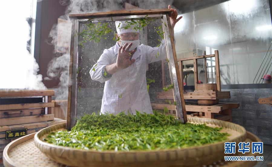 4月9日,在湖北省恩施市白杨坪乡洞下槽村,制茶师蒋子祥将鲜叶进行蒸汽杀青。 恩施玉露是产于湖北恩施的一种绿茶,采用一芽一叶、大小均匀的鲜叶为原料,其制作过程分为蒸汽杀青、摊凉、揉捻、烘焙、拣选等工艺。近年来,湖北省恩施土家族苗族自治州恩施市依托当地丰富的茶叶资源,大力培养恩施玉露制作技艺传人,使这一传统手工茶焕发活力。 新华社发(杨顺丕 摄)