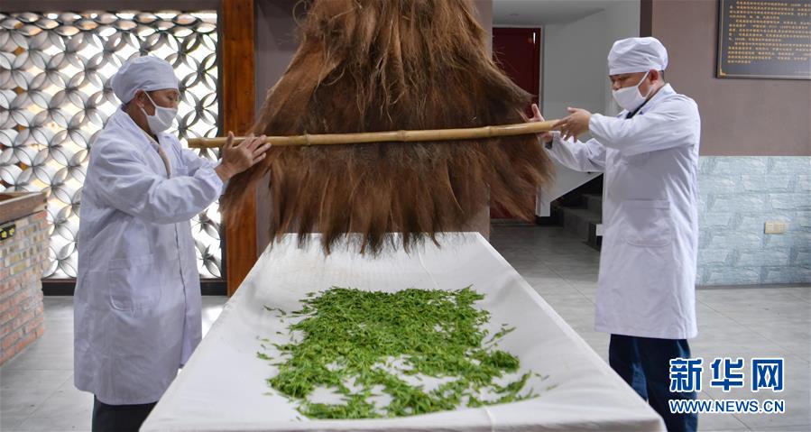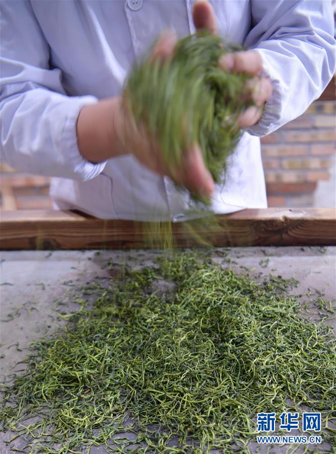 4月9日,在湖北省恩施市白杨坪乡洞下槽村,制茶师蒋子祥将杀青后的茶叶摊凉。 恩施玉露是产于湖北恩施的一种绿茶,采用一芽一叶、大小均匀的鲜叶为原料,其制作过程分为蒸汽杀青、摊凉、揉捻、烘焙、拣选等工艺。近年来,湖北省恩施土家族苗族自治州恩施市依托当地丰富的茶叶资源,大力培养恩施玉露制作技艺传人,使这一传统手工茶焕发活力。 新华社发(杨顺丕 摄)