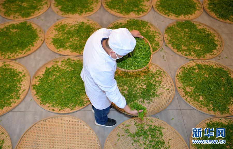 4月9日,在湖北省恩施市白杨坪乡洞下槽村,制茶师蒋子祥将鲜叶摊放散热。 恩施玉露是产于湖北恩施的一种绿茶,采用一芽一叶、大小均匀的鲜叶为原料,其制作过程分为蒸汽杀青、摊凉、揉捻、烘焙、拣选等工艺。近年来,湖北省恩施土家族苗族自治州恩施市依托当地丰富的茶叶资源,大力培养恩施玉露制作技艺传人,使这一传统手工茶焕发活力。 新华社发(杨顺丕 摄)