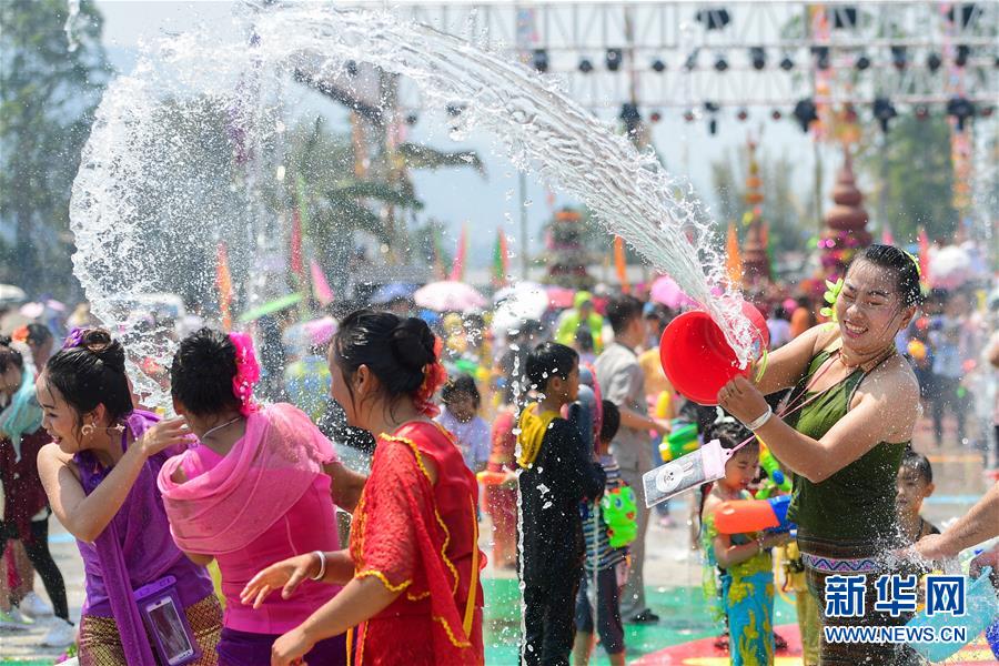4月13日,人们在景谷傣族彝族自治县文体中心广场上泼水狂欢。 当日,云南省普洱市景谷傣族彝族自治县举行2019年采花泼水节,人们欢聚一堂,用相互泼水的方式互送祝福、传递快乐。 新华社记者 胡超 摄