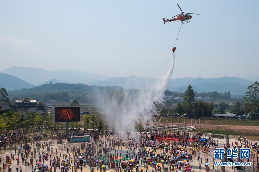 4月13日,一架直升机在景谷傣族彝族自治县文体中心广场上空洒水,泼水狂欢活动正式开始。 当日,云南省普洱市景谷傣族彝族自治县举行2019年采花泼水节,人们欢聚一堂,用相互泼水的方式互送祝福、传递快乐。 新华社记者 胡超 摄