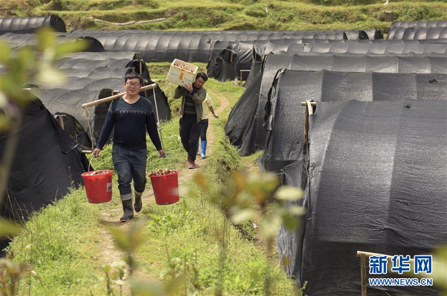 4月16日,在湖北省宣恩县张官铺食用菌专业合作社,负责人陈威(前)挑运羊肚菌。 今年30岁的陈威是湖北省宣恩县晓关侗族乡张官村人,2013年大学毕业后在浙江从事室内设计工作。2015年陈威返乡创业,成立张官铺食用菌专业合作社,专业种植羊肚菌。他研究羊肚菌生长习性,提升种植管理技术,种植基地由最初的10多亩发展到100多亩,带动当地50多户村民增收。 新华社发(王俊 摄)