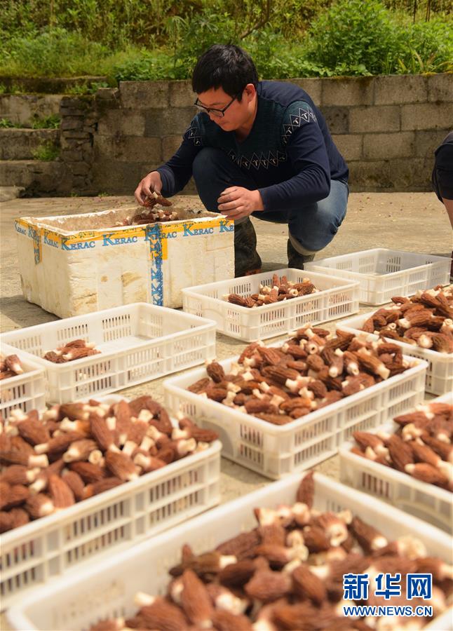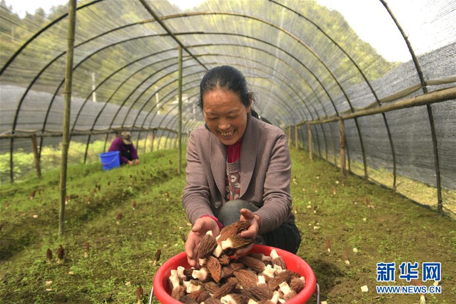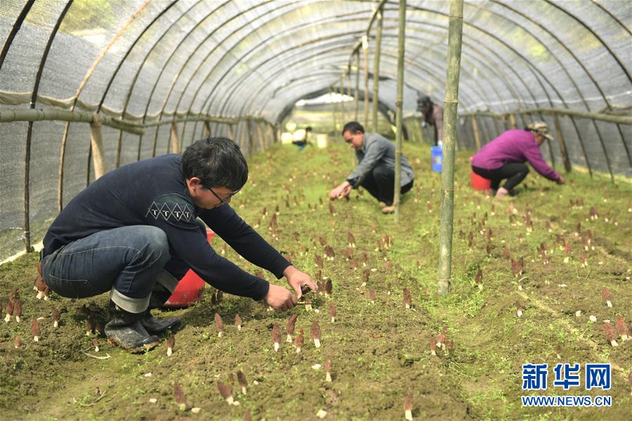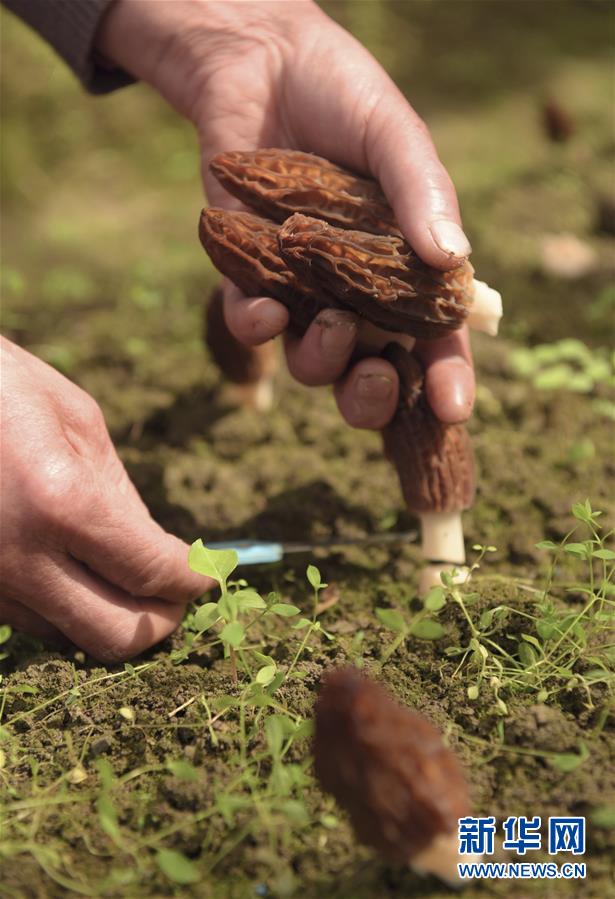4月16日,湖北省宣恩县张官铺食用菌专业合作社社员在采摘羊肚菌。 今年30岁的陈威是湖北省宣恩县晓关侗族乡张官村人,2013年大学毕业后在浙江从事室内设计工作。2015年陈威返乡创业,成立张官铺食用菌专业合作社,专业种植羊肚菌。他研究羊肚菌生长习性,提升种植管理技术,种植基地由最初的10多亩发展到100多亩,带动当地50多户村民增收。 新华社发(王俊 摄)