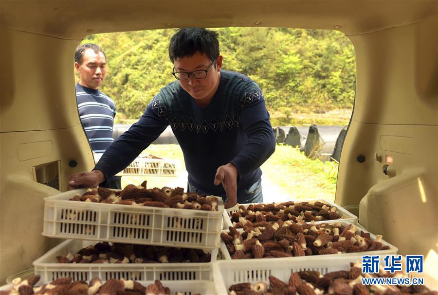 4月16日,在湖北省宣恩县张官铺食用菌专业合作社,负责人陈威将采摘好的羊肚菌放入车厢。 今年30岁的陈威是湖北省宣恩县晓关侗族乡张官村人,2013年大学毕业后在浙江从事室内设计工作。2015年陈威返乡创业,成立张官铺食用菌专业合作社,专业种植羊肚菌。他研究羊肚菌生长习性,提升种植管理技术,种植基地由最初的10多亩发展到100多亩,带动当地50多户村民增收。 新华社发(王俊 摄)