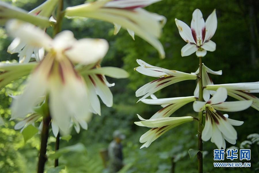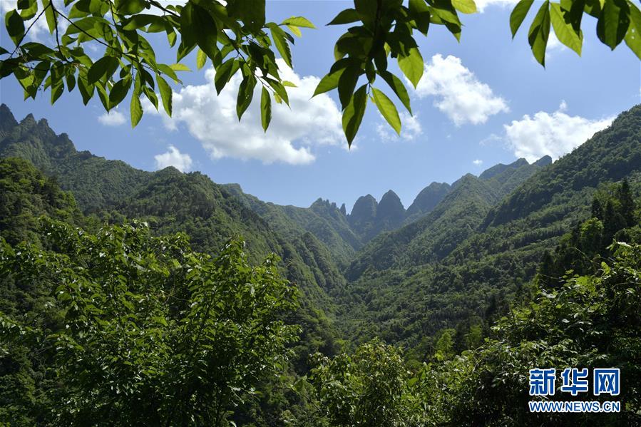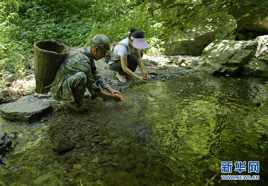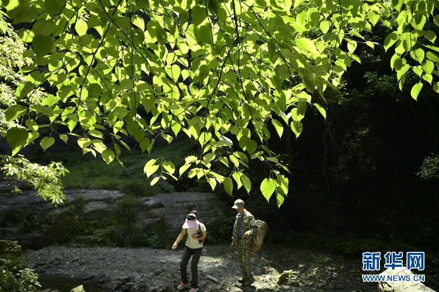 6月4日,张永祥(右)与七姊妹山管理局工作人员一同查看珙桐生长情况。新华社发(宋文 摄)