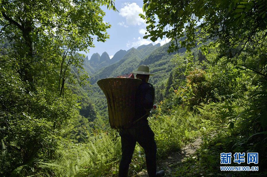 5月11日,张永升背着竹背篓,沿着崎岖小路往家中运送物资。新华社发(宋文 摄)