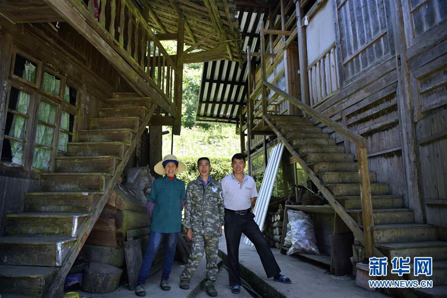 汤金芝(左一)和她的儿子张永祥(中)、张永升在七姊妹山下的家中(6月4日摄)。新华社发(宋文 摄)