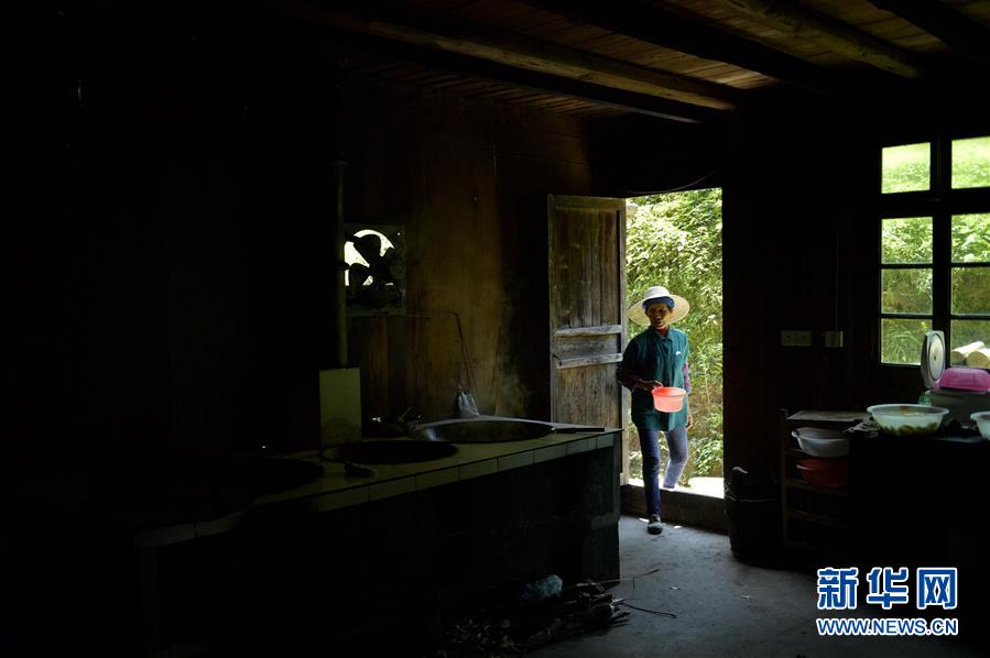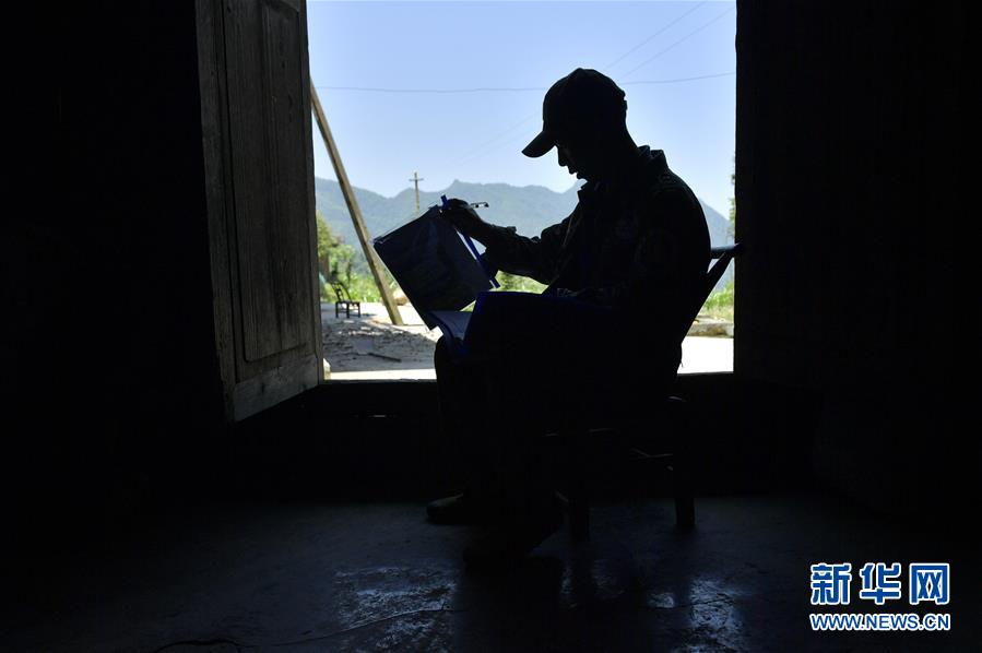 6月4日,张永祥巡山归来,在吊脚楼里写巡山日记。新华社发(宋文 摄)