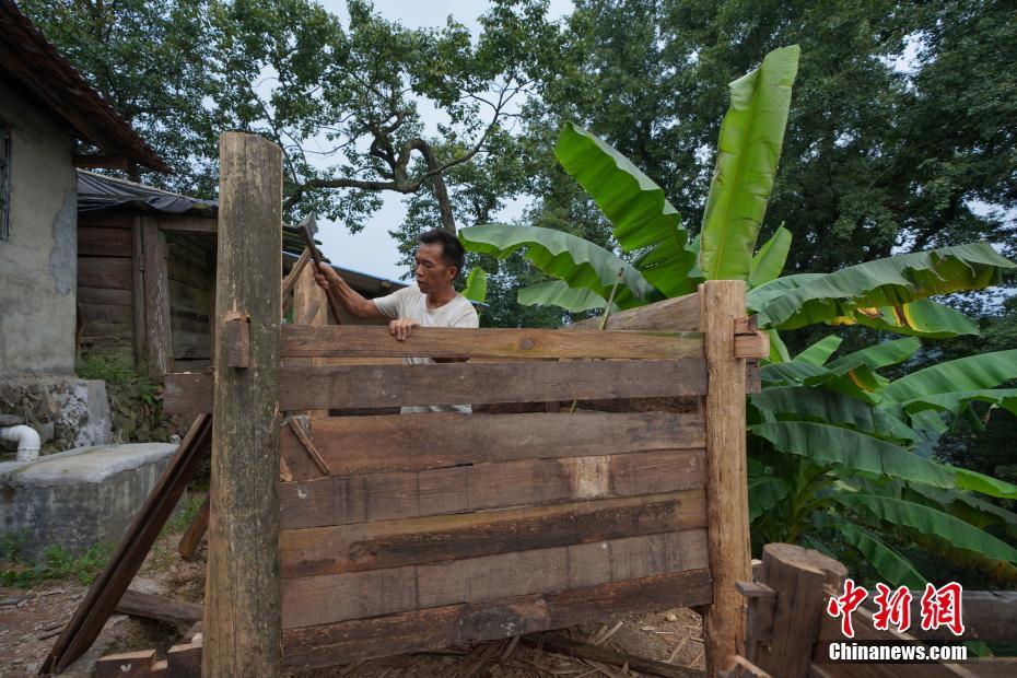 8月14日,贵州榕江计怀村村民侯国忠在村口修建猪圈。贵州省黔东南苗族侗族自治州榕江县是一个以苗、侗、水、瑶为主体民族的国家级贫困县。2019年以来,榕江借助国家大力推动“危房改造”的东风,结合东西部扶贫协作等力量,打响“人畜分居”攻坚战,帮助当地少数民族民众改造人畜混居式木质结构房屋,结束了当地民众长期以来“人畜同居”的生活方式。目前,榕江县已摸底“人畜混居”家庭户8066户,已改造2000多户,预计2019年10月底前完成改造工作,以改善民众居住条件和环境,保障民众基本卫生健康。中新社记者 贺俊怡 摄