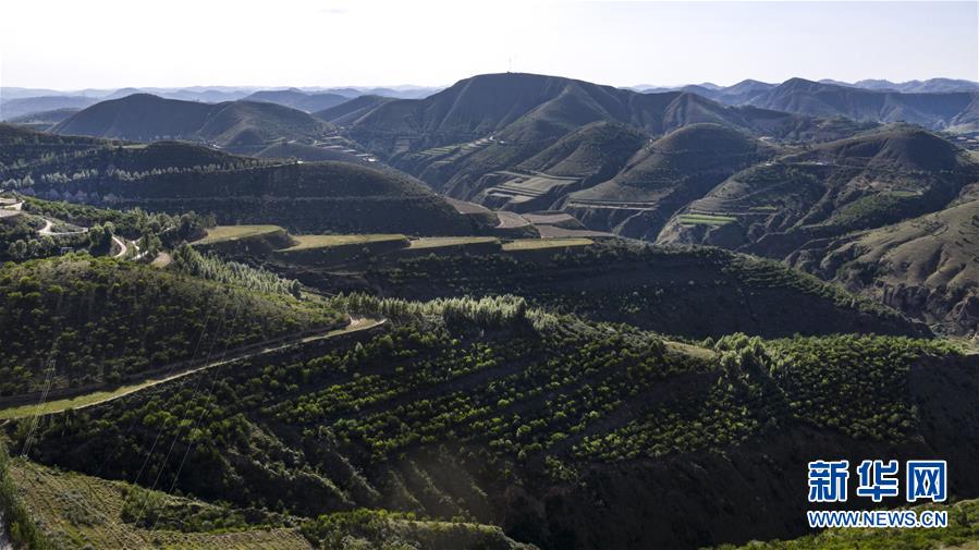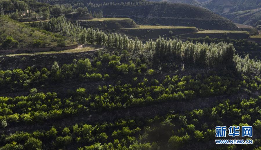 8月17日无人机拍摄的李树和的家庭林场,昔日黄土荒坡已被染绿。
