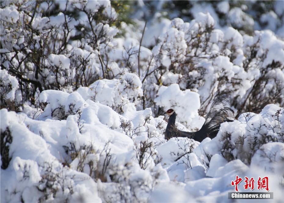 图为蓝马鸡在雪地中觅食。 王超 摄