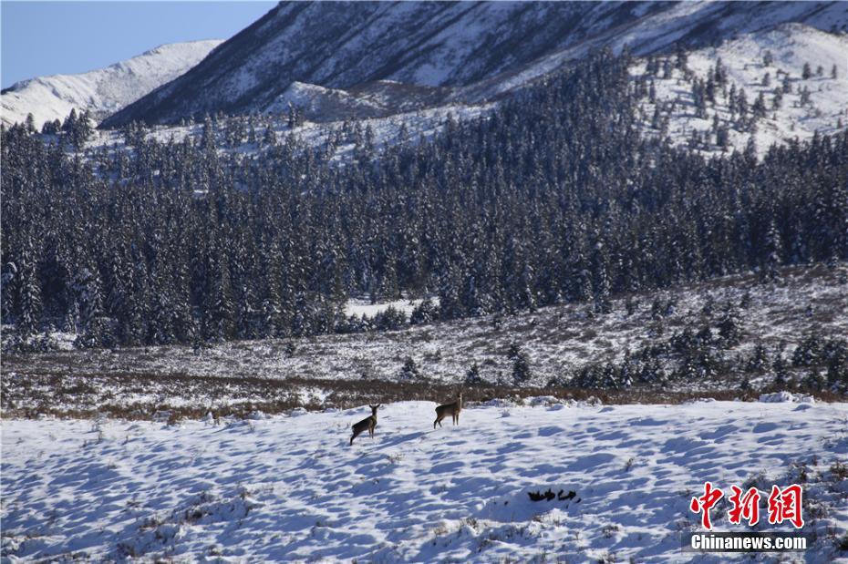 图为两只狍鹿在雪地中觅食。 王超 摄