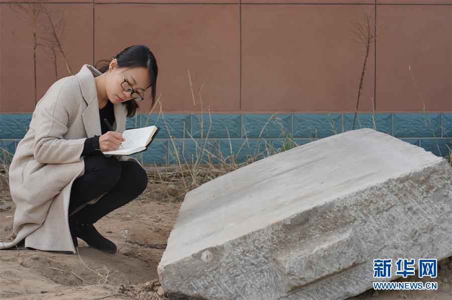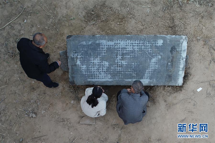 新河县文保工作人员在抄录“重修堂阳书院记”碑的碑文(10月30日摄)。 河北新河县文保部门日前在进行文物排查时发现一块清光绪年间石碑,记载了当时官办教学场所“堂阳书院”发展历史及重修过程,距今约137年。 新华社记者巩志宏摄