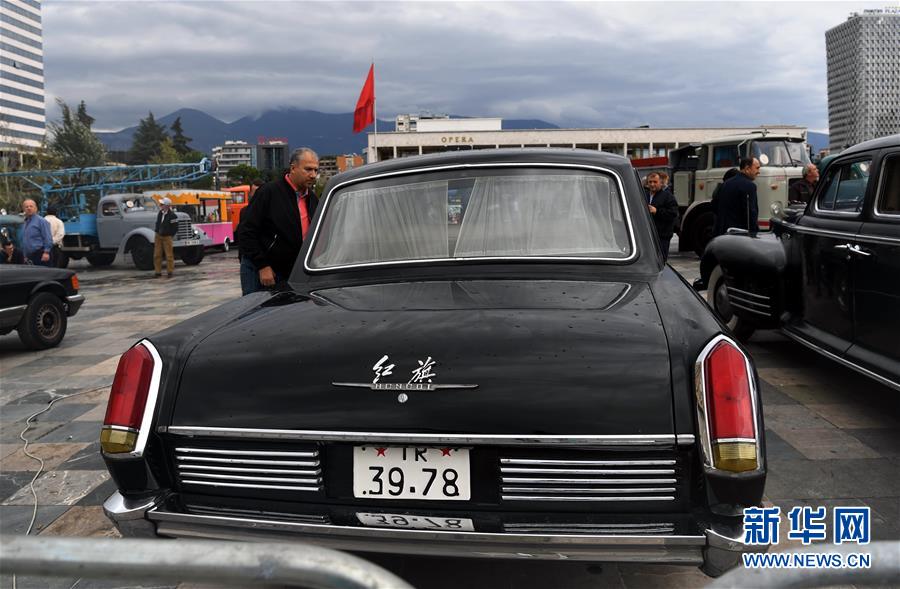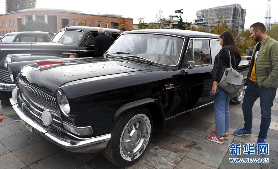 11月3日,在阿尔巴尼亚首都地拉那,人们在“怀旧”车展上参观中国生产的红旗轿车。