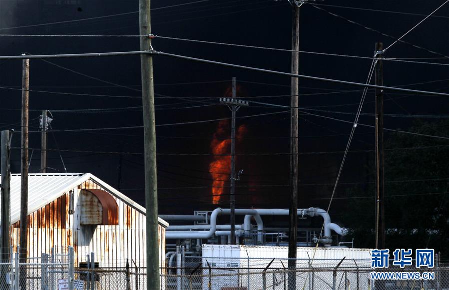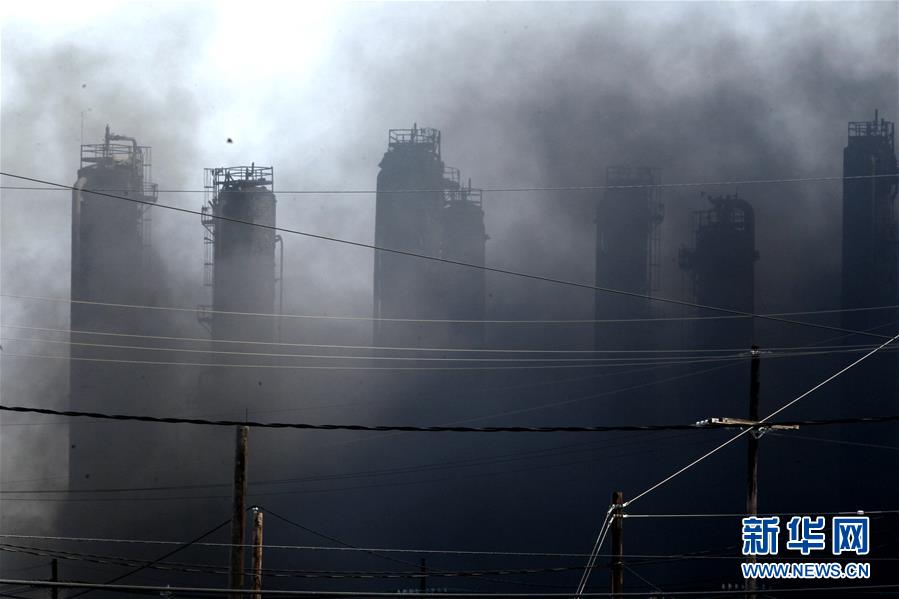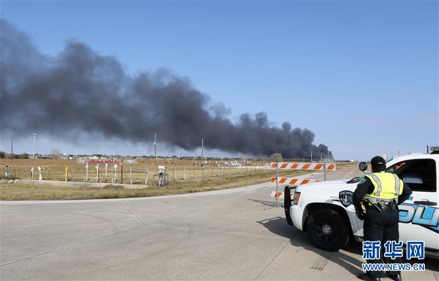 11月27日,在美国得克萨斯州杰斐逊县,发生爆炸的化工厂浓烟滚滚。 美国得克萨斯州杰斐逊县内奇斯港一座化工厂27日凌晨发生爆炸,目前造成3人受伤。 新华社发(宋穹 摄)
