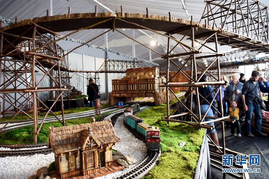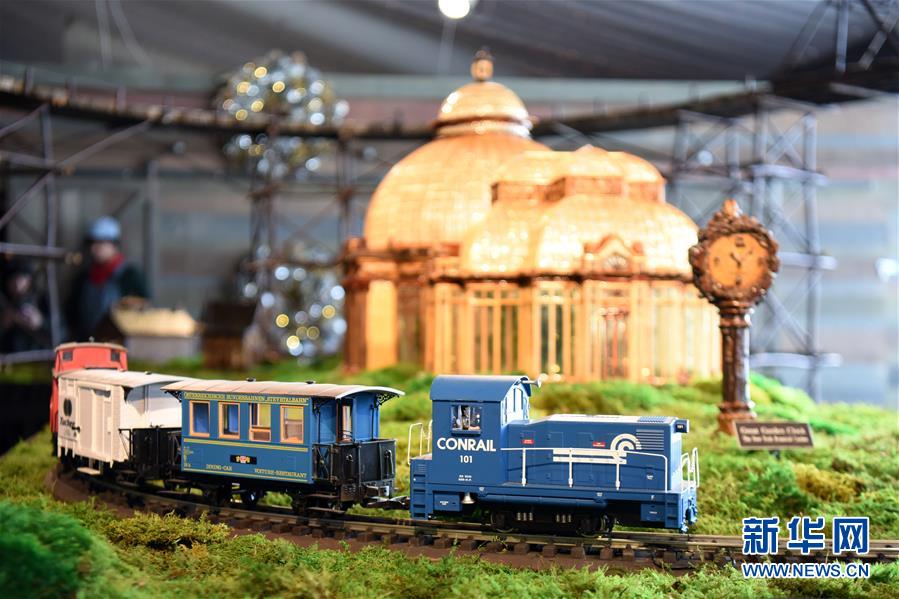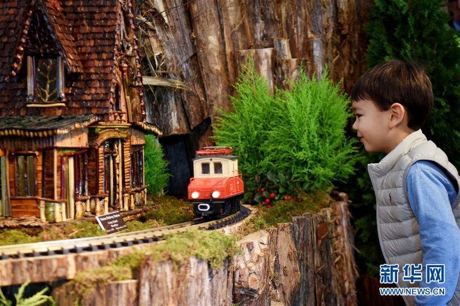 11月26日,在美国纽约植物园节日小火车展上,游客观看模型小火车和纽约微缩景观。 新华社记者 韩芳 摄