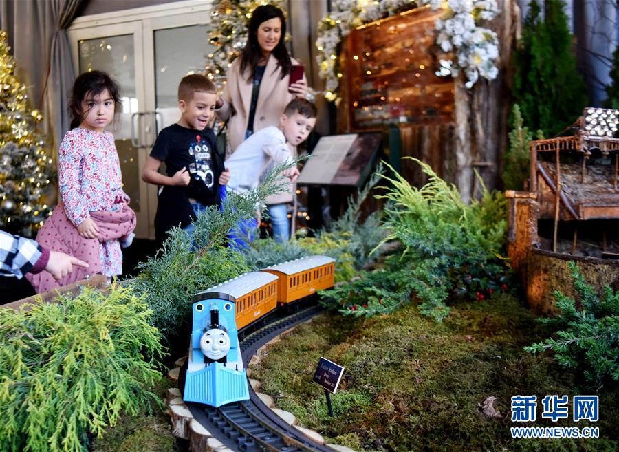 11月26日,在美国纽约植物园节日小火车展上,儿童观看托马斯模型小火车。 新华社记者 韩芳 摄
