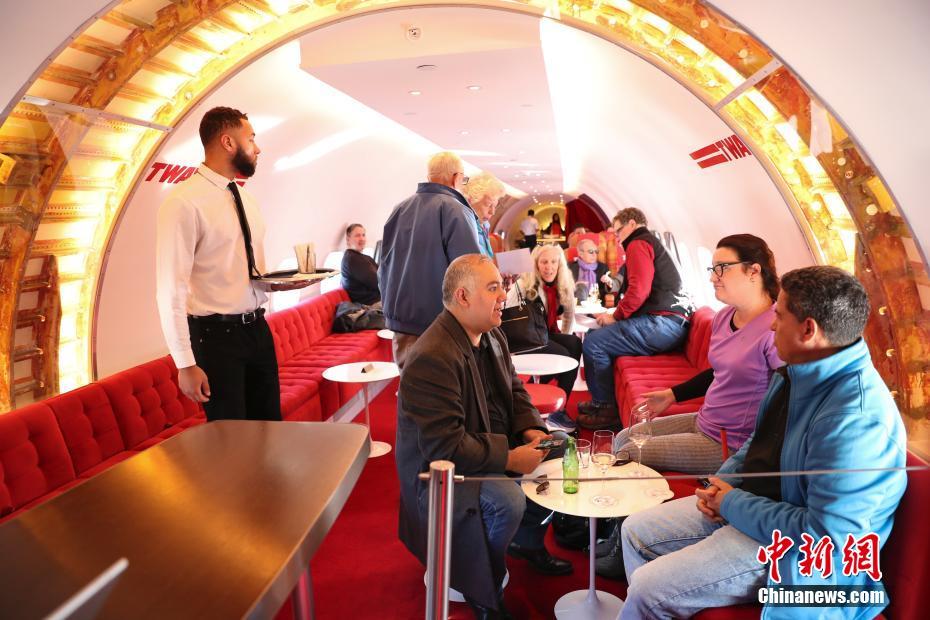 当地时间11月30日,纽约肯尼迪机场TWA机场酒店将一架老式“星座”客机改建为鸡尾酒吧,机舱内的酒吧顾客满座。中新社记者 廖攀 摄