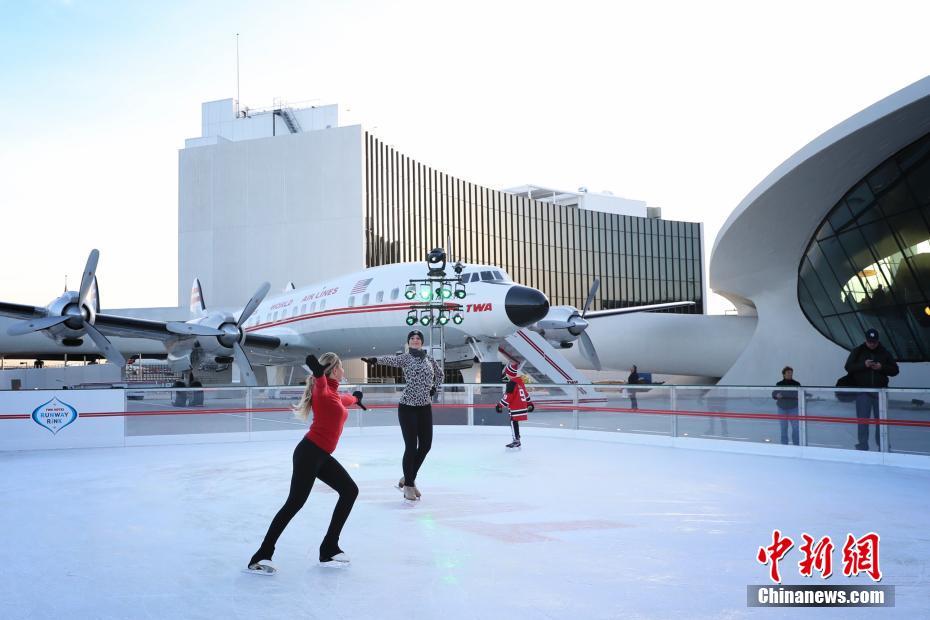 当地时间11月30日,纽约肯尼迪机场TWA机场酒店新建滑冰场营业第一天受到民众欢迎,许多民众前来老式“星座”客机前滑冰。中新社记者 廖攀 摄