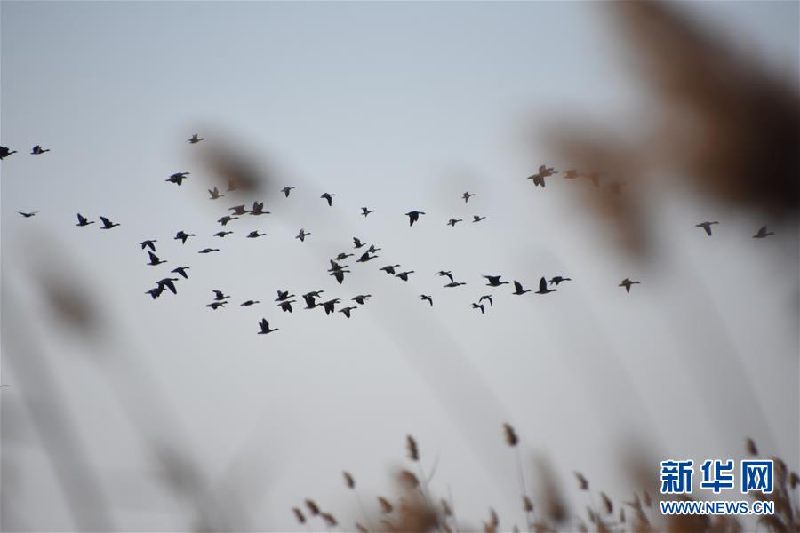 在天津北大港湿地自然保护区,一群鸟儿从芦苇荡中飞起(12月2日摄)。新华社记者 张宇琪 摄