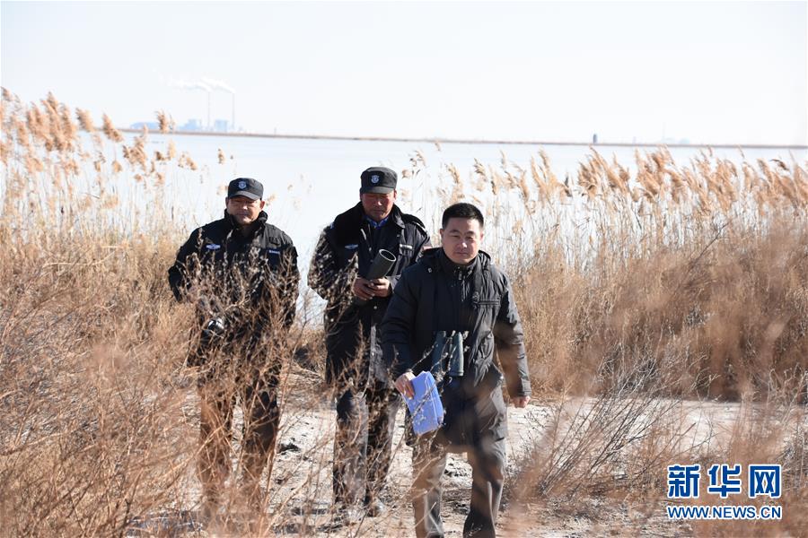 在天津北大港湿地自然保护区,野生鸟类保护员姚庆峰(右一)和同事一起对鸟类进行巡护(12月2日摄)。新华社记者 张宇琪 摄