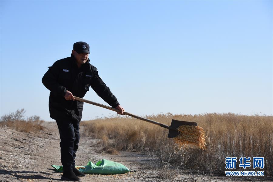 在天津北大港湿地自然保护区,野生鸟类保护员在鸟类出没的地带撒放玉米等谷物(12月2日摄)。新华社记者 张宇琪 摄