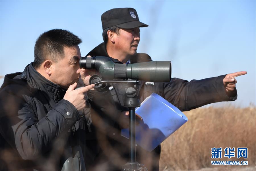 在天津北大港湿地自然保护区,野生鸟类保护员姚庆峰(左)和同事一起对鸟类进行监测(12月2日摄)。新华社记者 张宇琪 摄