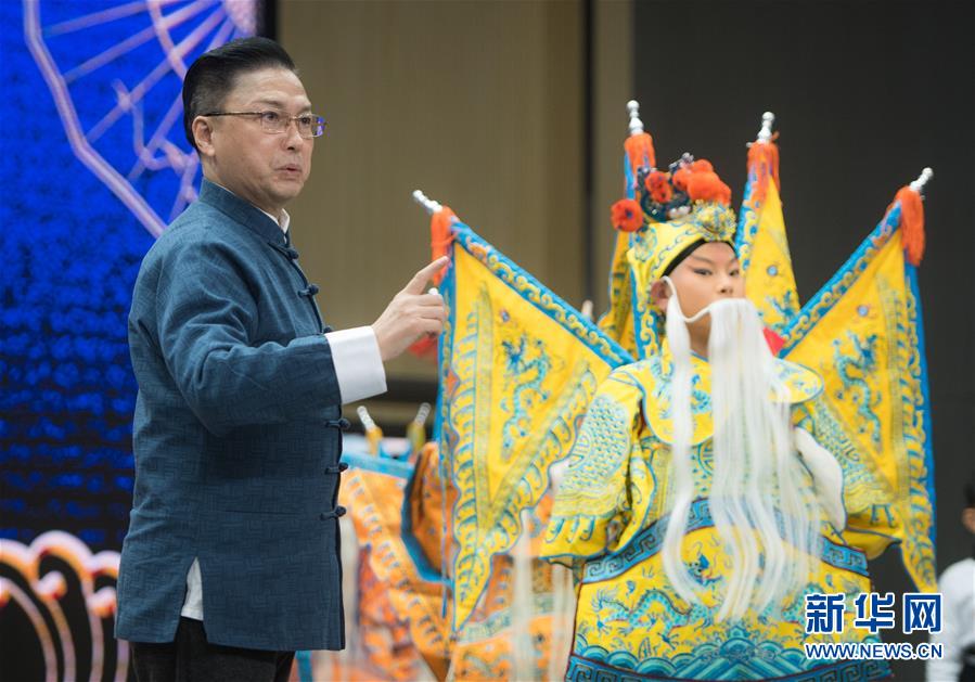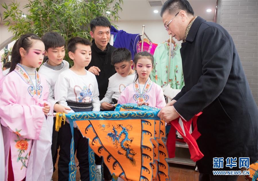 12月10日,京剧谭门第六代传人谭孝曾(右一)为小学生讲授京剧知识。 当日,“2019京剧谭门故乡(江夏)行——国粹传承娃娃声”活动在武汉长春街小学举行。谭孝曾、阎桂祥等京剧艺术家与小戏迷互动,讲授和示范京剧表演艺术技巧。 新华社记者 肖艺九 摄