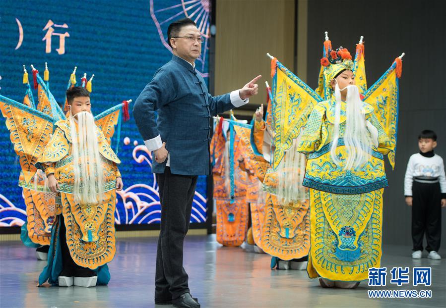 12月10日,京剧谭门第六代传人谭孝曾(中)和小学生们同台表演京剧《定军山》选段。 当日,“2019京剧谭门故乡(江夏)行——国粹传承娃娃声”活动在武汉长春街小学举行。谭孝曾、阎桂祥等京剧艺术家与小戏迷互动,讲授和示范京剧表演艺术技巧。 新华社记者 肖艺九 摄