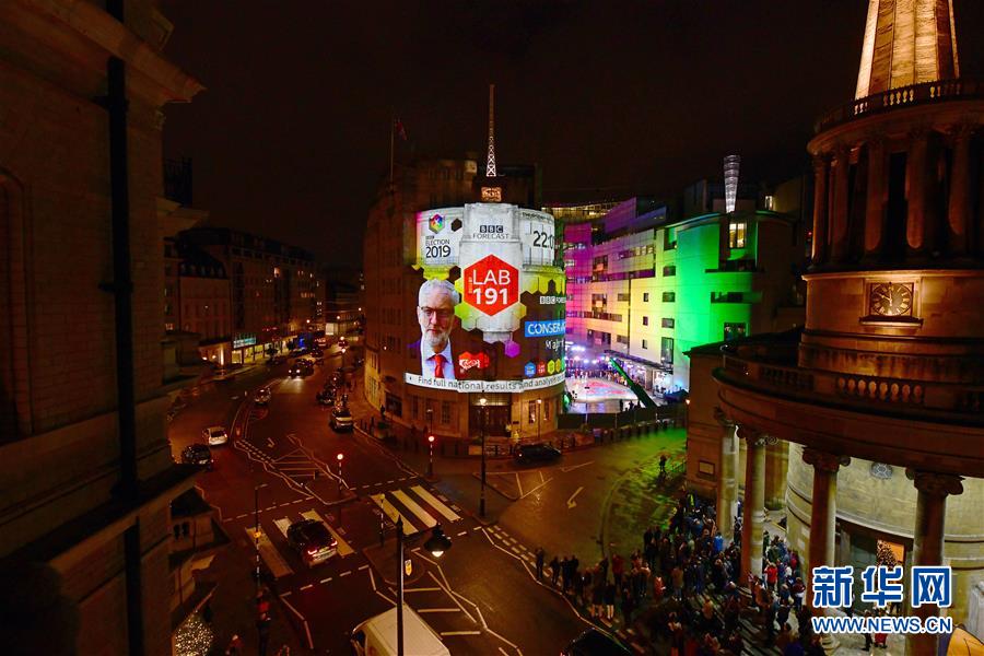 12月12日,在英国伦敦,出口民调结果显示在一处大楼上。 新华社发(BBC摄影师杰夫·奥弗斯摄)