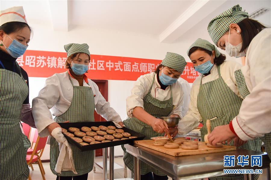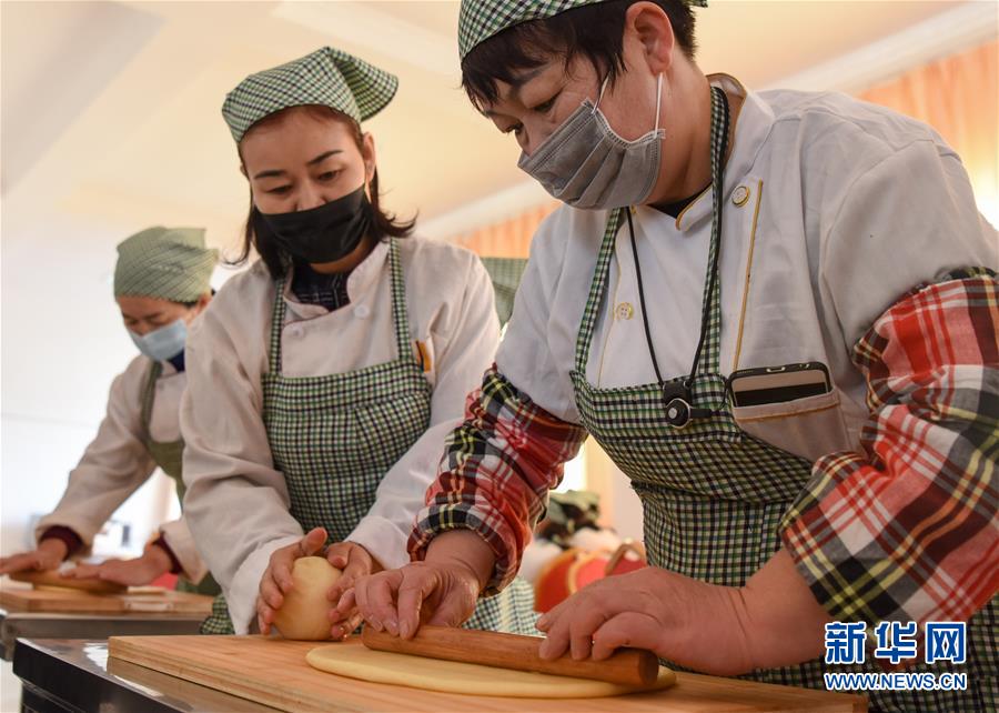 在昭苏县昭苏镇解放路社区,参加中式面点培训班的农牧民在进行实操练习(12月14日摄)。新华社记者 丁磊 摄