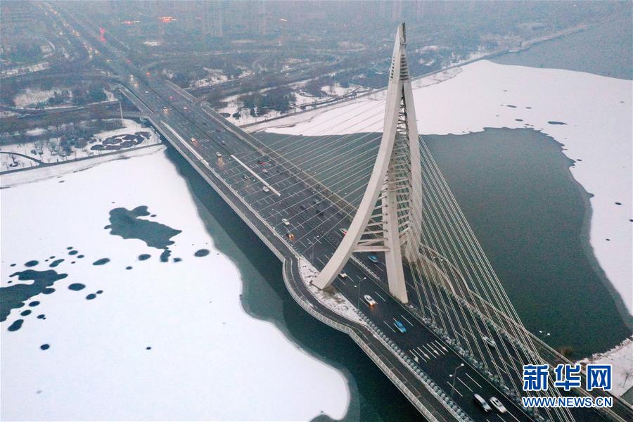这是12月15日无人机拍摄的太原市汾河及岸边的雪景。新华社记者曹阳摄