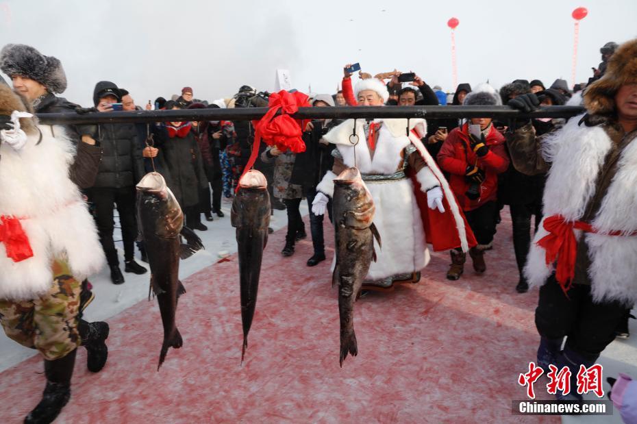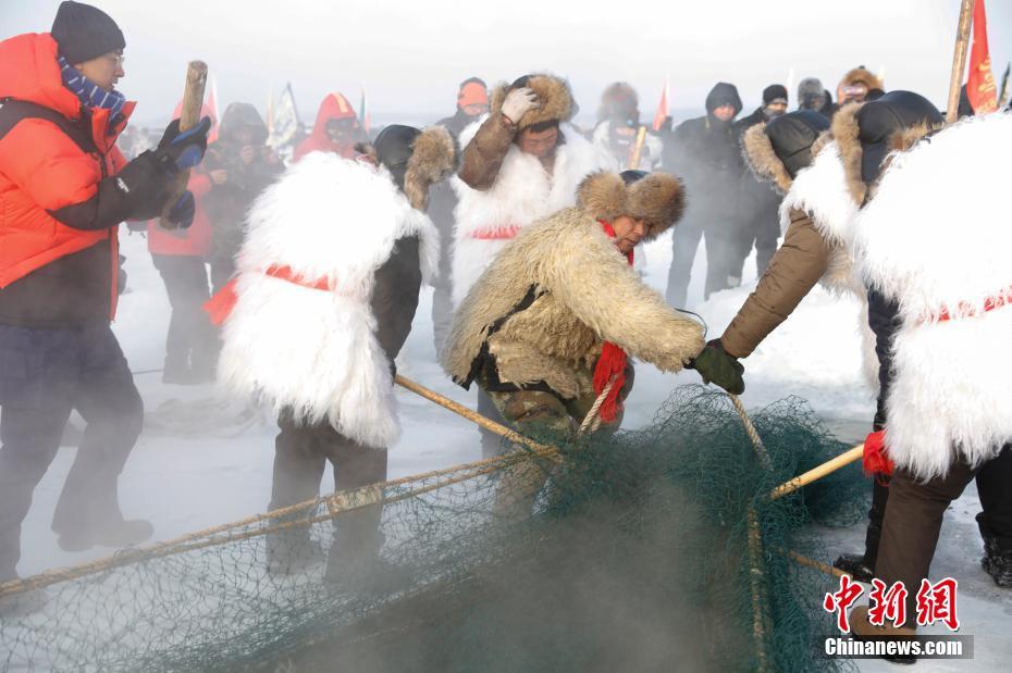 12月22日,“冬日渔歌·第四届五大连池冬捕节”在黑龙江五大连池火山堰塞湖第三池启幕。图为“头鱼”出网。中新社记者 吕品 摄