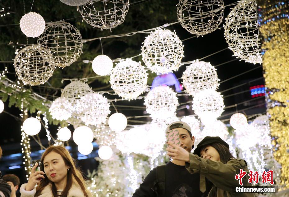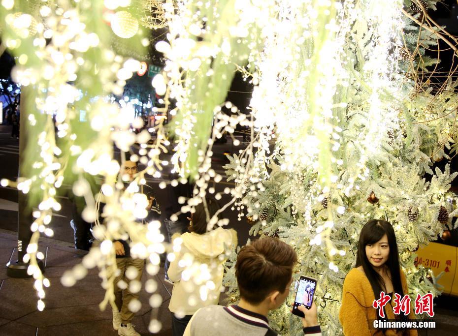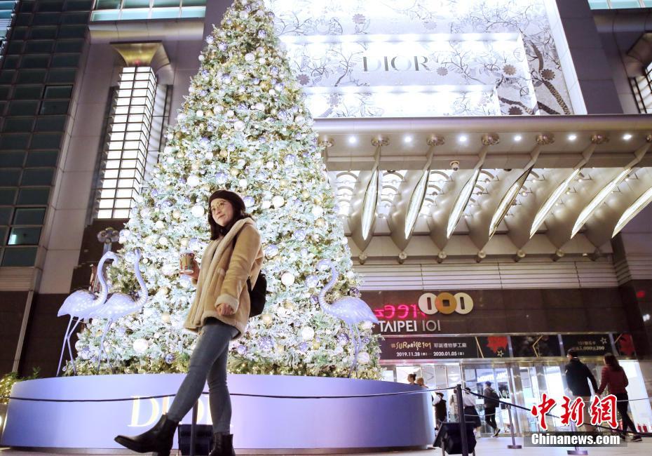 12月23日,位于台北市信义区的地标建筑101大楼前点亮巨型圣诞树,梦幻闪亮的圣诞美陈吸引大批市民、游客前往参观。中新社记者 史元丰 摄