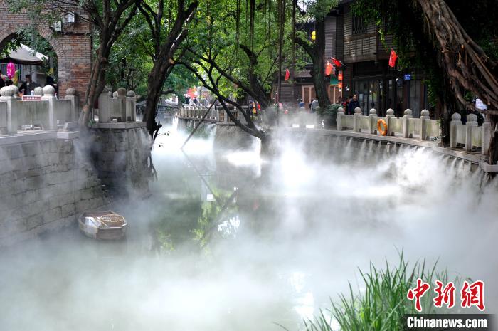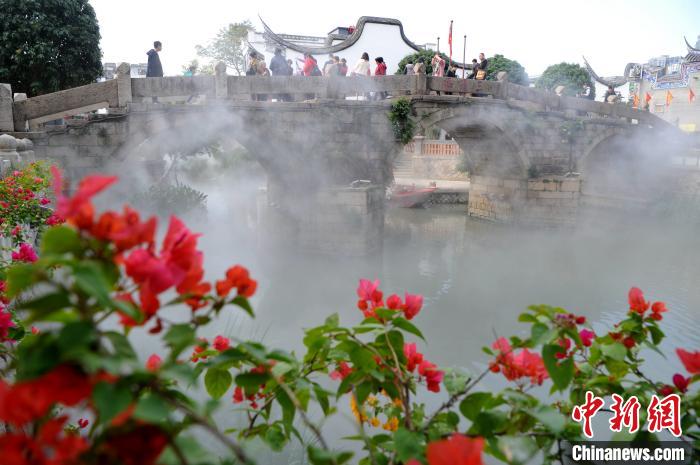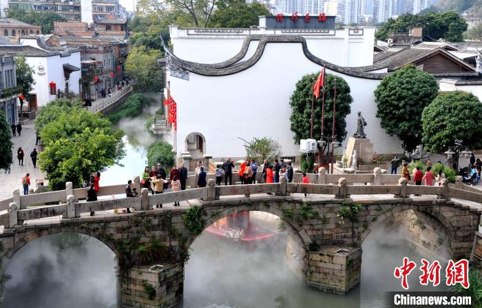 图为喷雾装置在古香古色的福州上下杭历史文化街区营造出云蒸霞蔚的缥缈意境,仿佛“人间仙境”。 张斌 摄
