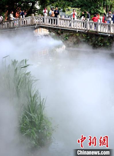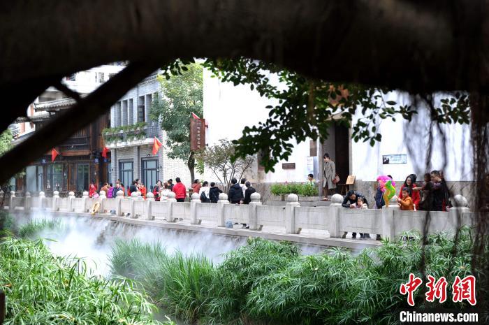1月1日,喷雾装置在古香古色的福州上下杭历史文化街区营造出云蒸霞蔚的缥缈意境,仿佛“人间仙境”,吸引了许多市民和游客前来游玩。