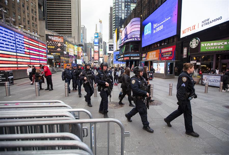 1月6日,警察在美国纽约时报广场执勤。 伊朗伊斯兰革命卫队下属“圣城旅”指挥官苏莱曼尼3日在伊拉克首都巴格达遭美军袭击身亡后,美国纽约市宣布在重要场所加强警戒。 新华社记者 王迎 摄