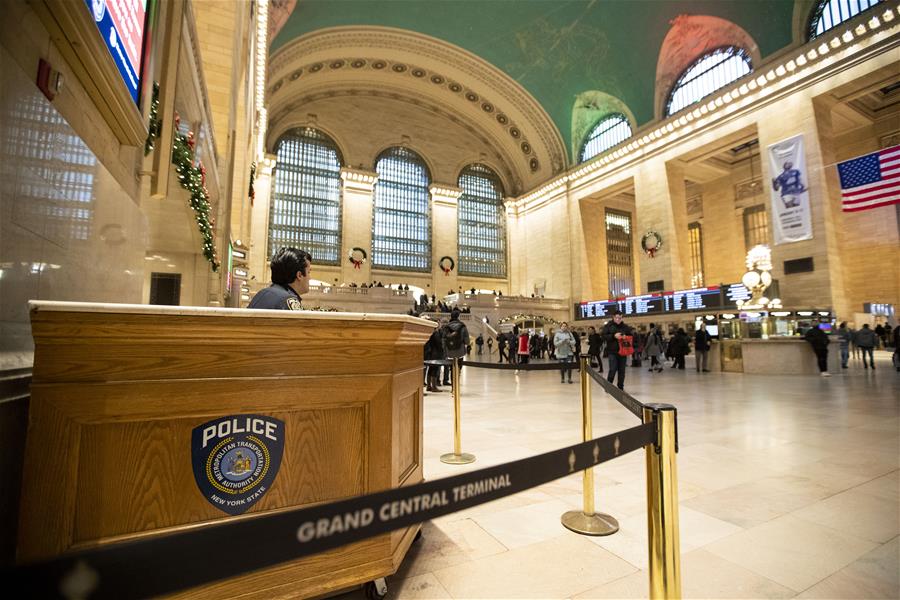 1月6日,警察在美国纽约中央车站执勤。 伊朗伊斯兰革命卫队下属“圣城旅”指挥官苏莱曼尼3日在伊拉克首都巴格达遭美军袭击身亡后,美国纽约市宣布在重要场所加强警戒。 新华社记者 王迎 摄