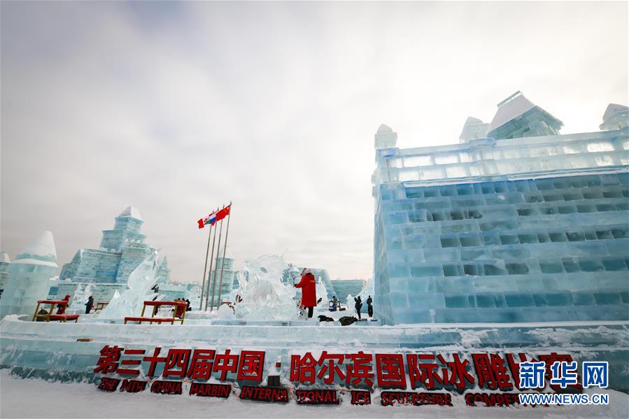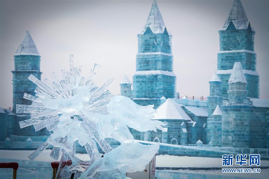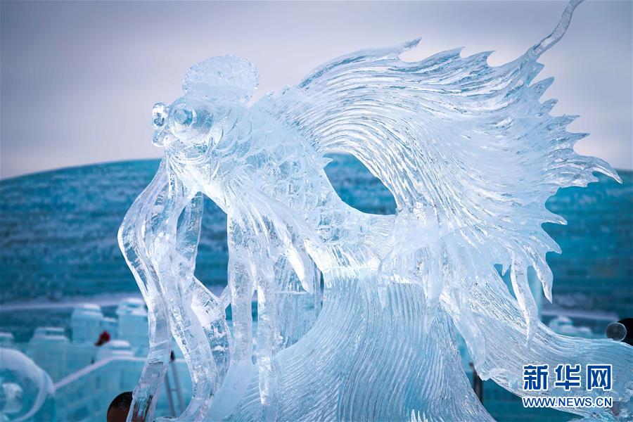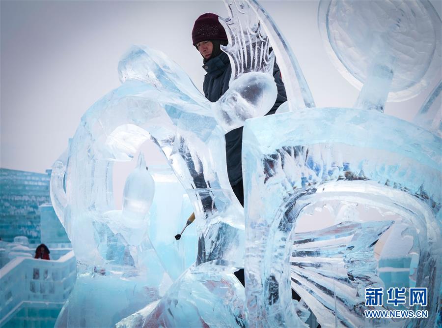 冰雕师在哈尔滨冰雪大世界内雕刻出主题各异的冰雕作品(1月8日摄)。 近日,在哈尔滨冰雪大世界园区内举行的各项冰雕赛事中,经过来自世界各地的冰雕选手悉心雕琢,一块块冰变身为精美的艺术作品,数十座冰雕仿佛晶莹剔透的出“冰”芙蓉。 新华社记者 王松 摄