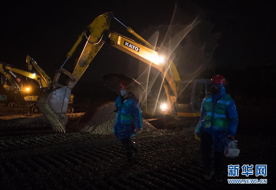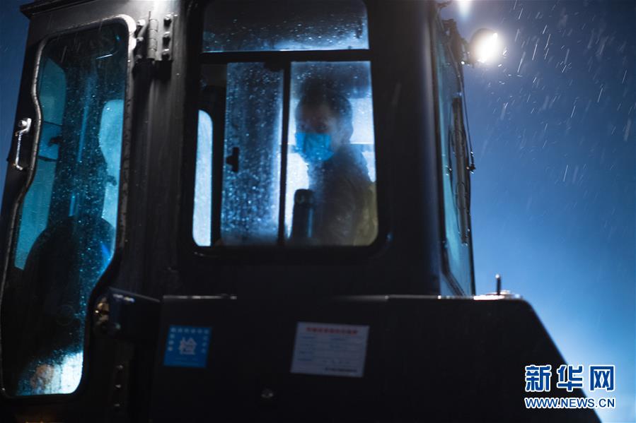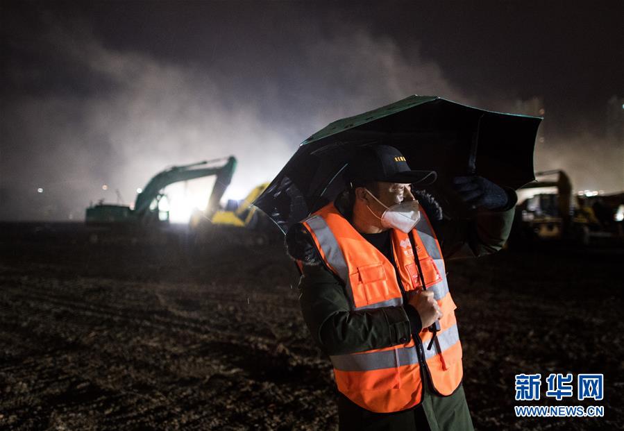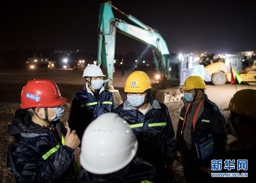 1月24日,在武汉火神山医院建设工地,施工交通指挥员郭胜和在指挥机械车辆。 除夕夜,武汉火神山医院建设工地灯火通明,建设团队放弃与家人团聚,加紧建设这座专门医院。 武汉市参照2003年抗击非典期间北京小汤山医院模式,正在蔡甸区建设的专门医院正式命名为火神山医院。新医院计划于2月3日建成,集中收治新型冠状病毒感染的肺炎患者。 新华社记者 肖艺九 摄