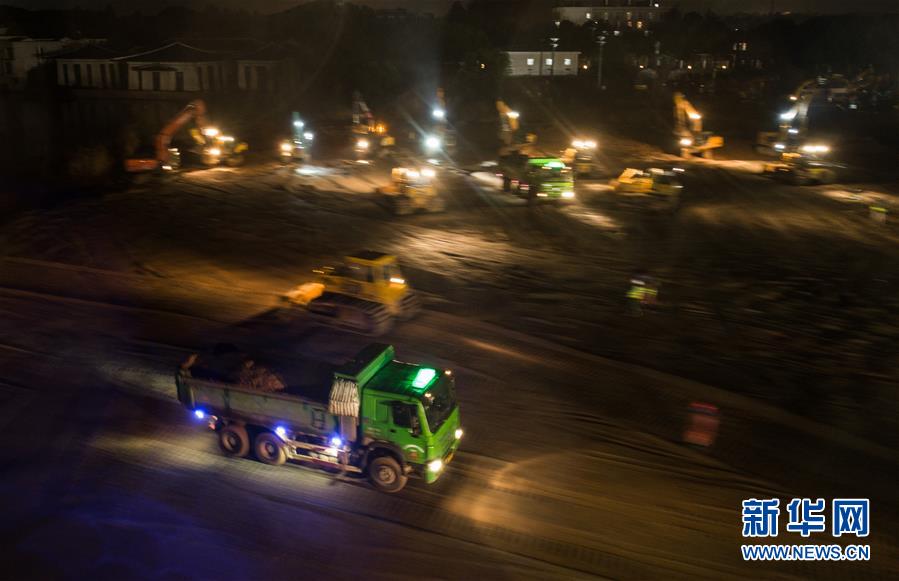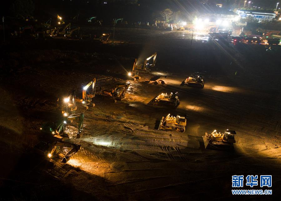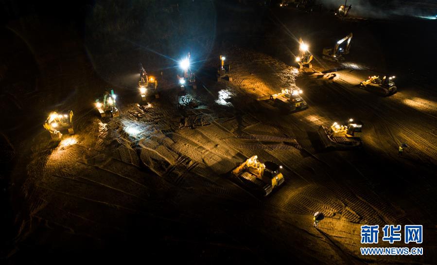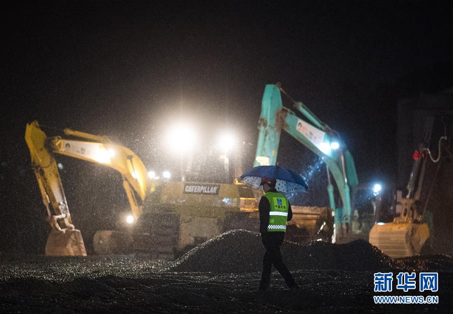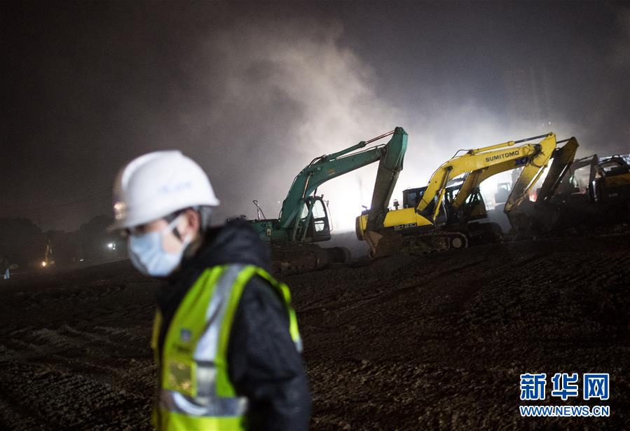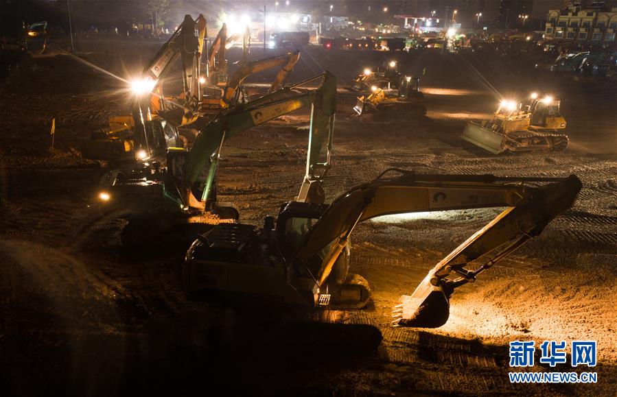 1月24日,在武汉火神山医院建设工地,大型机械加紧施工。 除夕夜,武汉火神山医院建设工地灯火通明,建设团队放弃与家人团聚,加紧建设这座专门医院。 武汉市参照2003年抗击非典期间北京小汤山医院模式,正在蔡甸区建设的专门医院正式命名为火神山医院。新医院计划于2月3日建成,集中收治新型冠状病毒感染的肺炎患者。 新华社记者 肖艺九 摄